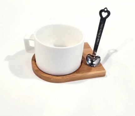 كوب سيراميك مع ملعقة وقاعدة بامبو – قابل للطباعة الحرارية